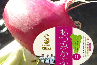 農園貞太郎は、なんとあつみかぶの生産量が全国No.1なのです。400年近い栽培の歴史がある在来作物のあつみかぶを、より多くの方に味わっていただけるよう大量生産しています。主に定番の赤かぶ甘酢漬の材料として出荷されていますが、しゃっきっとした歯ごたえと独特の辛みは、サラダやソテーにしてもおいしくいただけます。